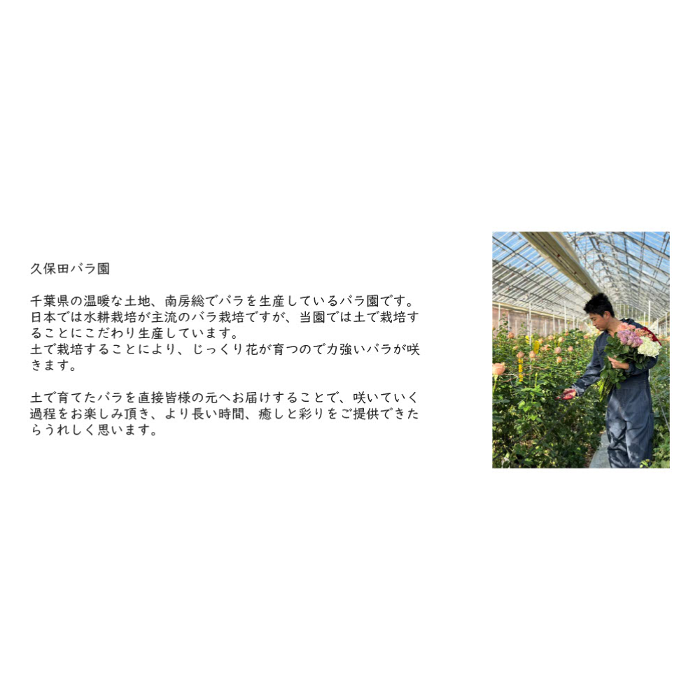 久保田バラ園のバラ【アマダ】を中心に、カーネーション、カラー、季節のグリーンを組み合わせた上品で華やかなアレンジメントです。
