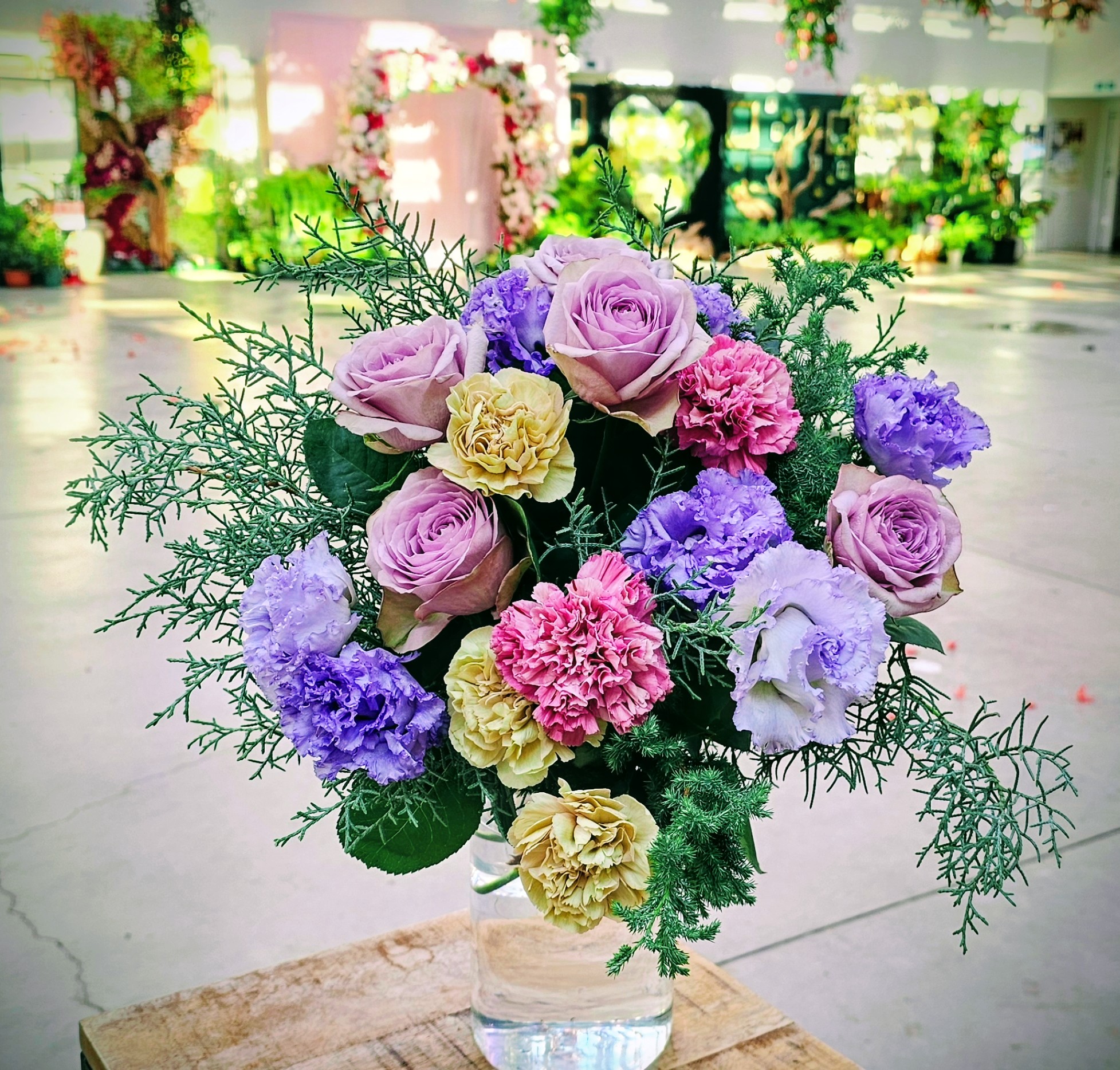 久保田バラ園の「ライラッククラシック」を中心に、カーネーション、トルコキキョウ、季節のグリーンを組み合わせた華やかで上品な花束。